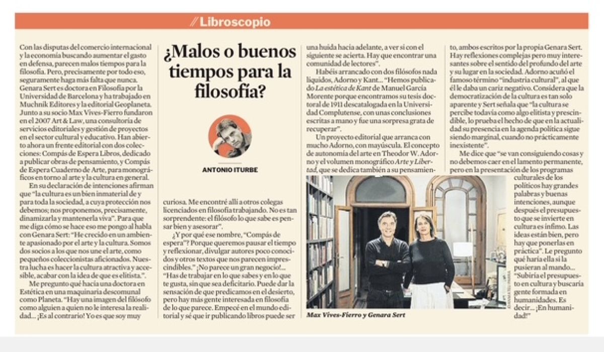 El 26 de abril de 2025 se publicó un artículo en la sección Libroscopio de La Vanguardia, titulado ¿Malos o buenos tiempos para la filosofía? y escrito por Antonio Iturbe. En el artículo se hace hincapié en el peso de la filosofía en nuestra editorial Art & Law (El derecho al arte), como lo da cuenta el hecho de que una de sus colecciones, como es COMPÁS DE ESPERA LIBROS, se dedica a divulgar textos de pensadores poco reconocidos, así como a recuperar obras imprescindibles de la historia del pensamiento. Asimismo el mismo nombre, que denomina la otra colección (Compás de Espera Cuaderno de Arte), incide en la importancia de detener el tiempo al tiempo que invita a reflexionar, practicando siempre una mirada crítica y no dejando de estar alerta y atento al mundo que nos rodea.
